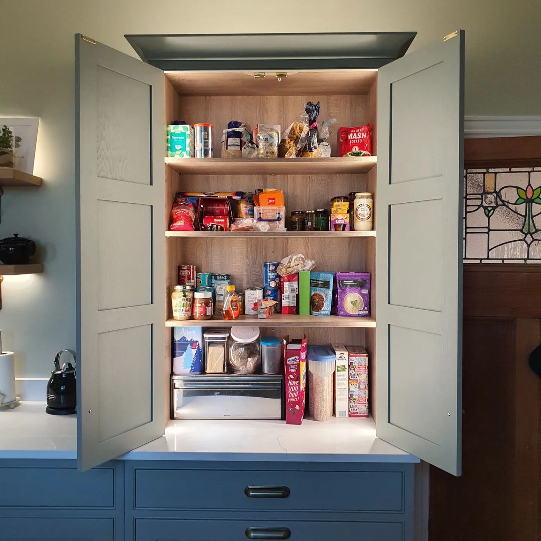 This particular kitchen is our bespoke 'made-to-order' cockbeaded inframe in Ash. This has been sprayed in Farrow & Ball Pigeon. Stunning!